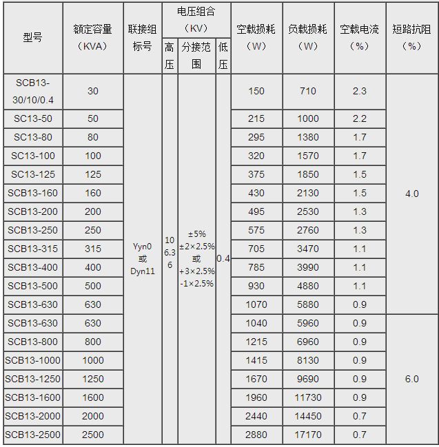 SCB13干式變壓器技術(shù)參數(shù)表: